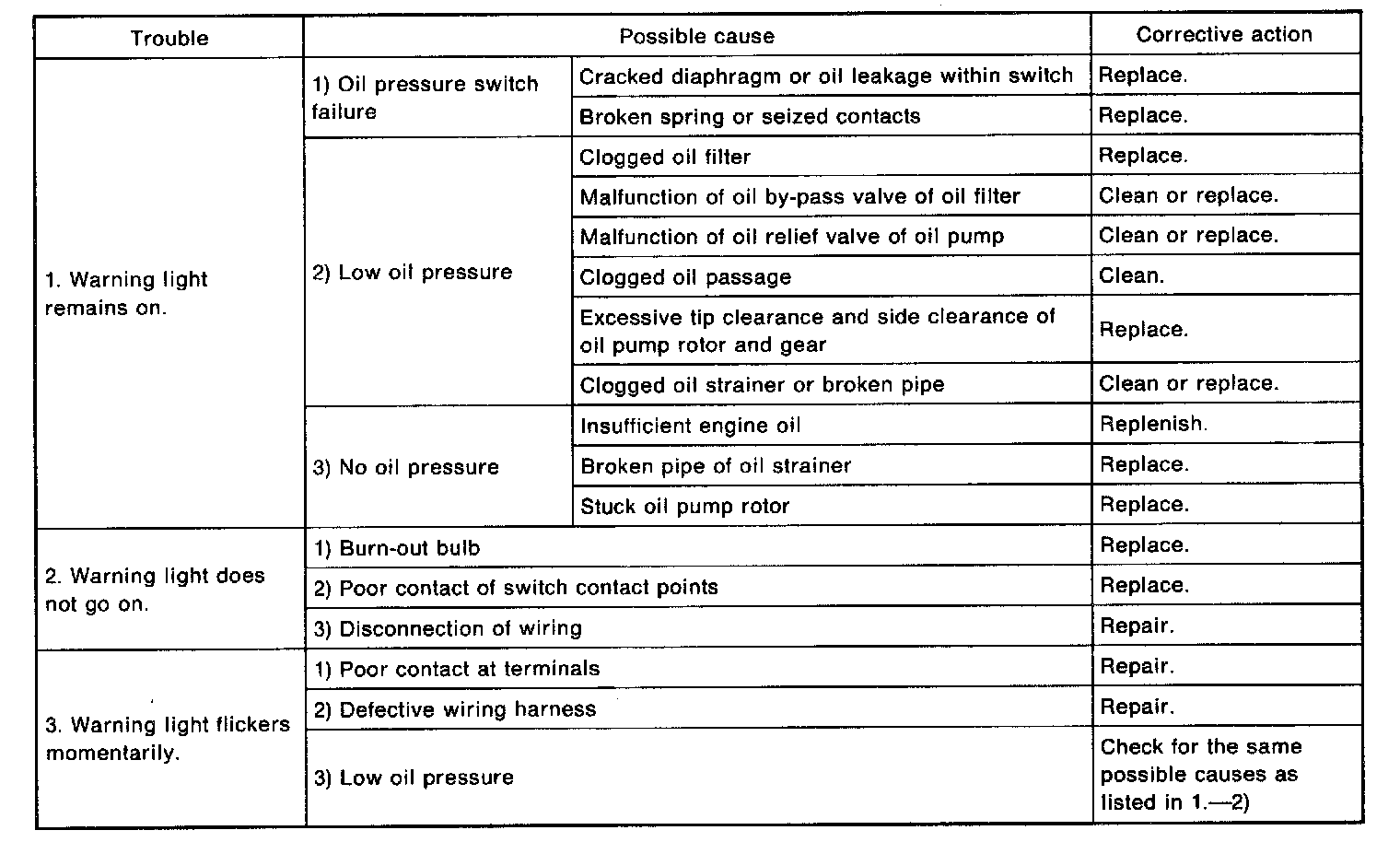 Before troubleshooting, make sure that the engine oil level is correct and no oil leakage exists.