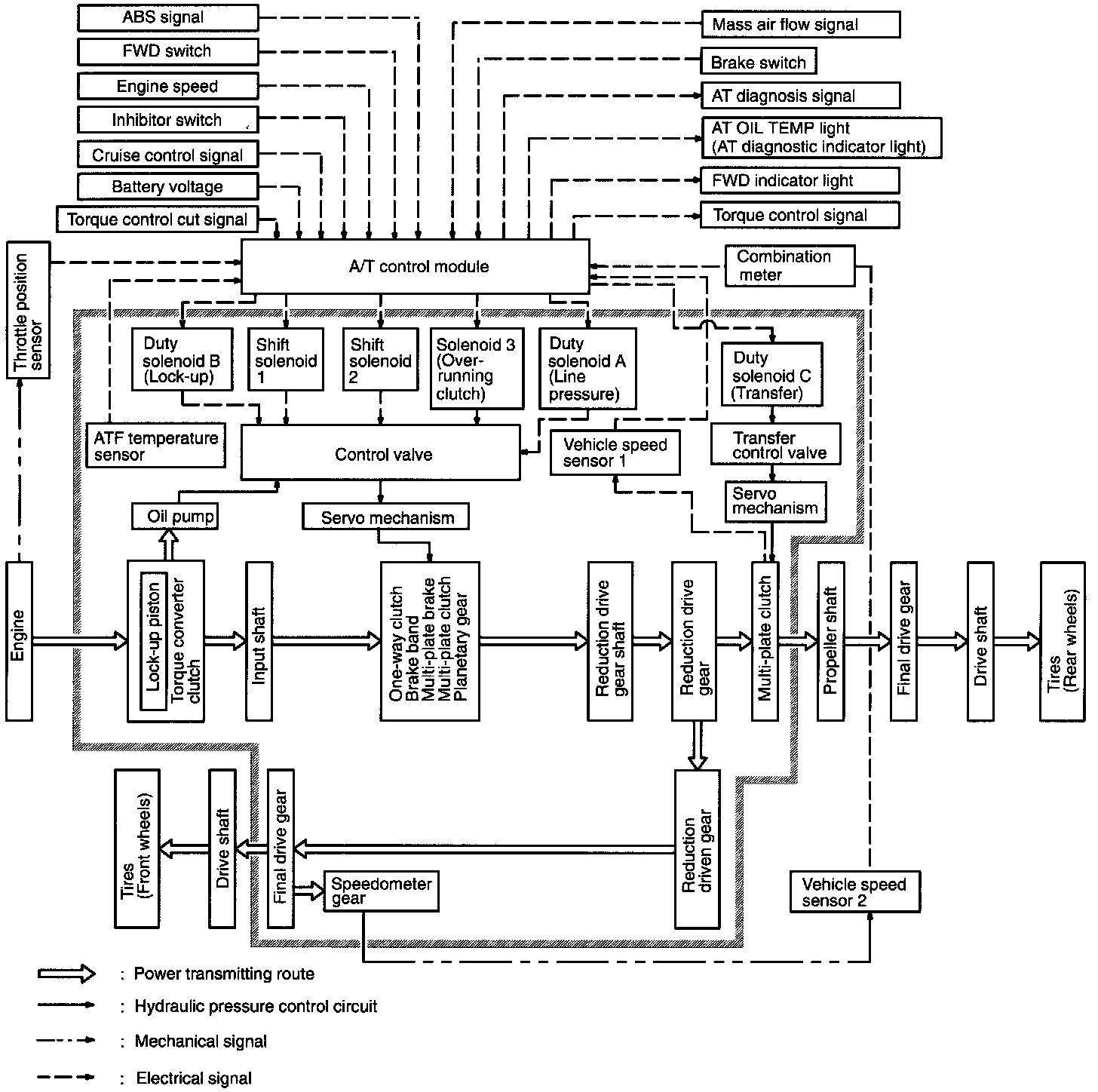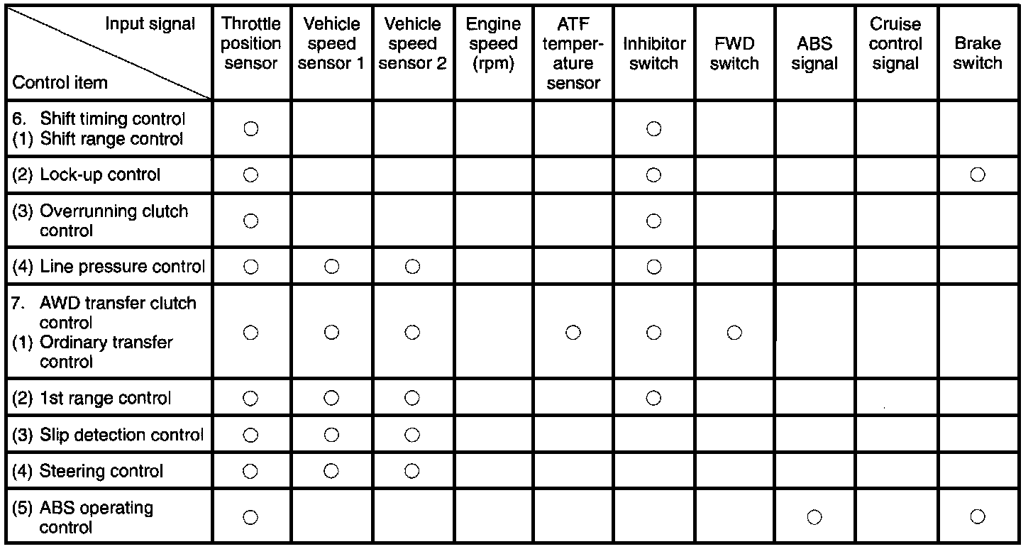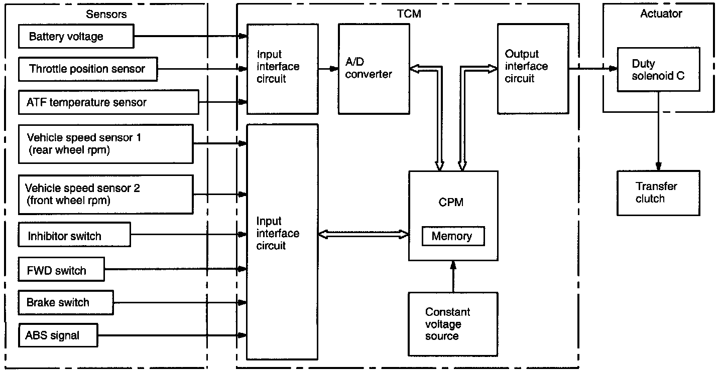 PURPOSE/OPERATIONThe Transmission Control Module (TCM) receives various sensor signals and determines the running conditions of the vehicle. It then sends control signals to each solenoid according to the preset gearshift characteristic data lockup operation data and transfer clutch torque data (duty ratio).