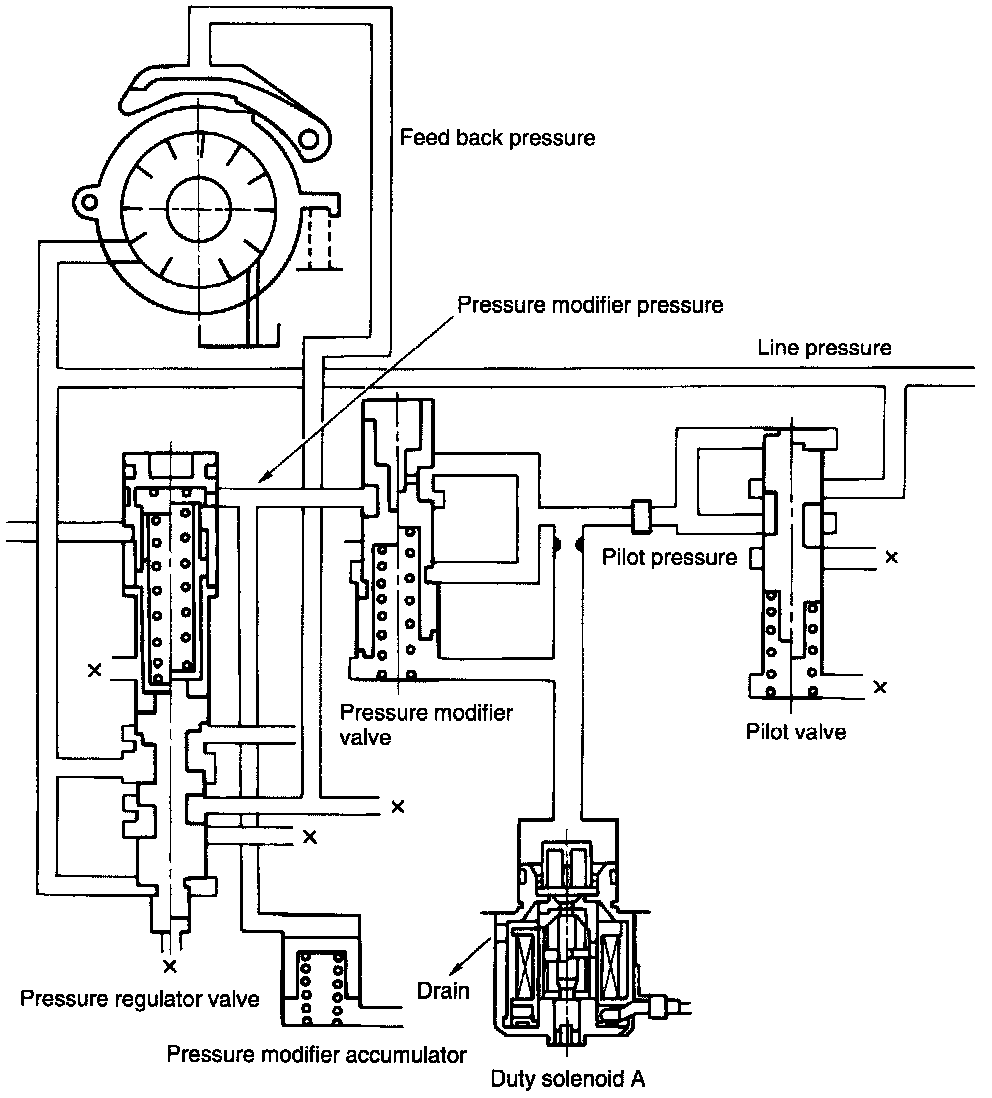 2. The pilot pressure applied to the pressure modifier valve is regulated by the line pressure controlling duty solenoid A and changed into the pressure modifier pressure.