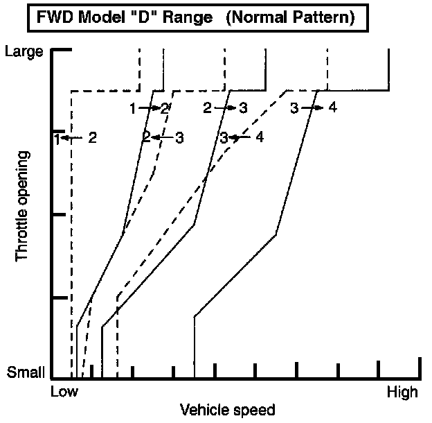 Gearshifting is controlled in response to driving conditions, according to the shift point characteristic data, as shown in the diagram, stored in the Transmission Control Module (TCM). Solenoids are operated at the proper time corresponding to the shift pattern, throttle position, and vehicle speed for smooth shifting.