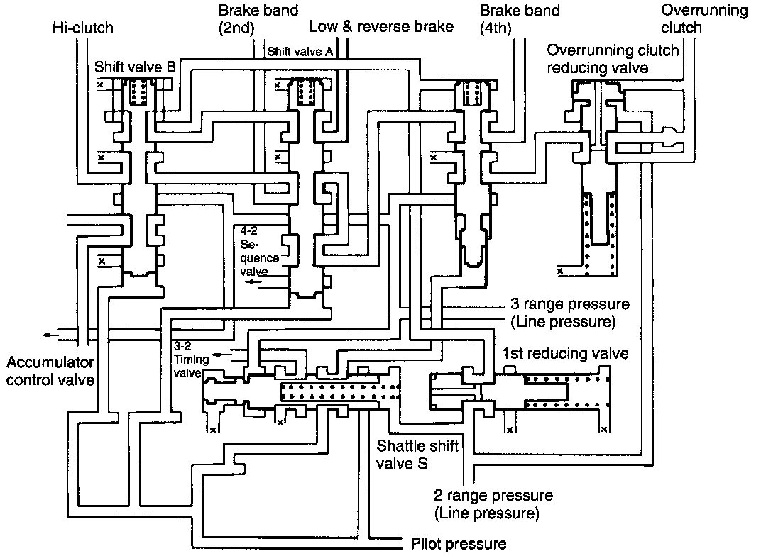 1. In range D or 3, the overrunning clutch is kept inoperative by the action of the shuttle shift valve S when the throttle position is large. With small Throttle valve opening, the overrunning clutch is engaged by the action of shift solenoid 3.