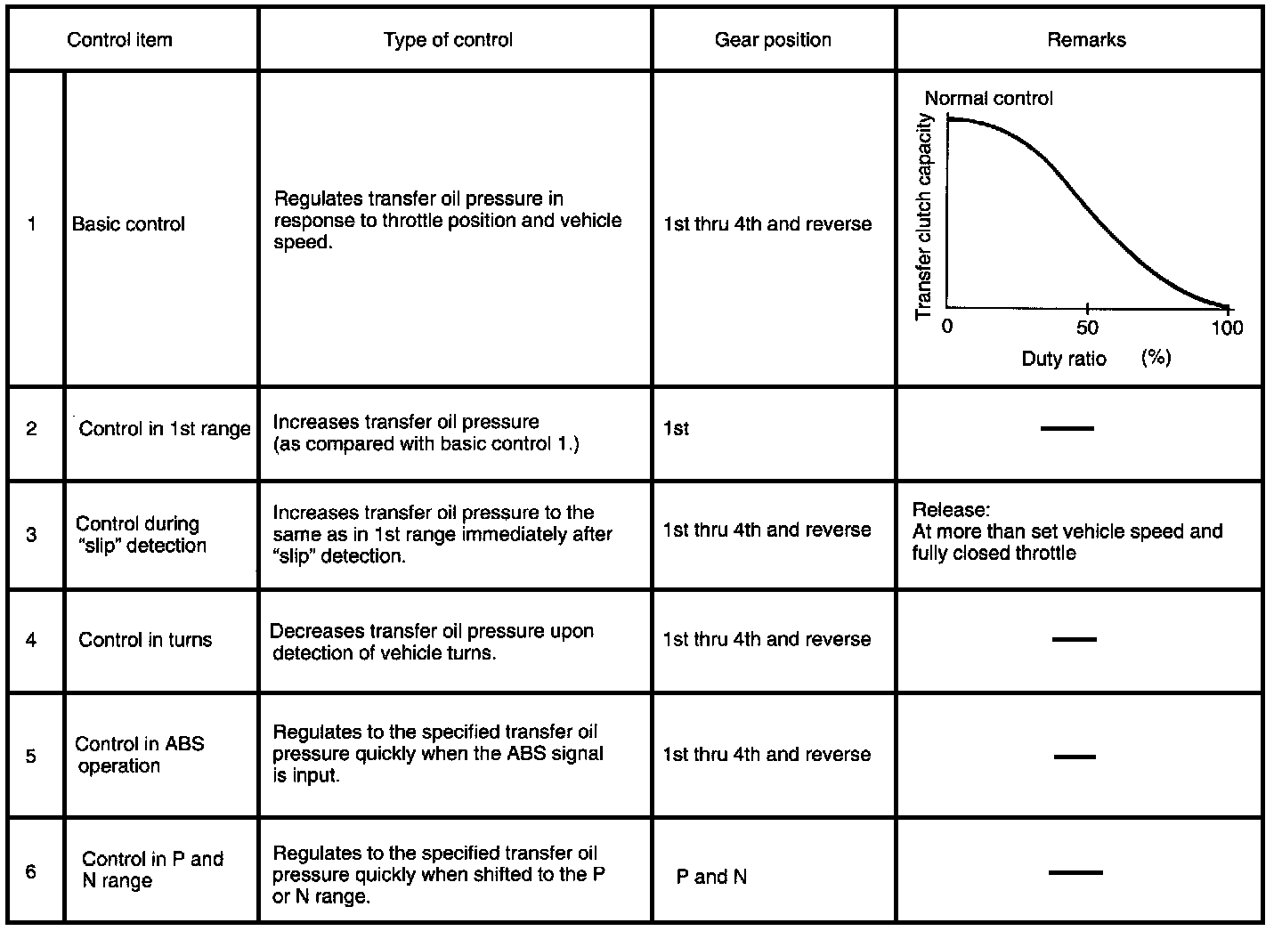 - The hydraulic oil pressure (line pressure) is regulated by the transfer pilot valve, duty solenoid c and transfer control valve for obtaining optimum rear torque distribution corresponding to the driving conditions.