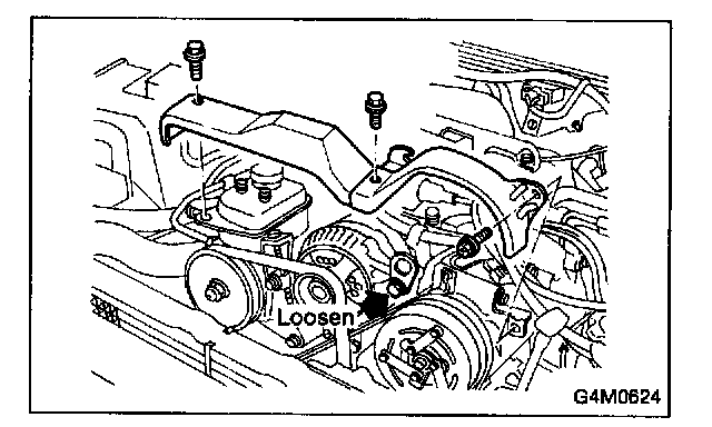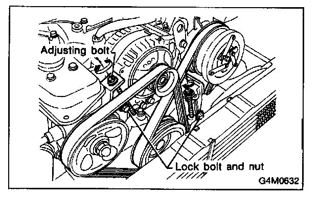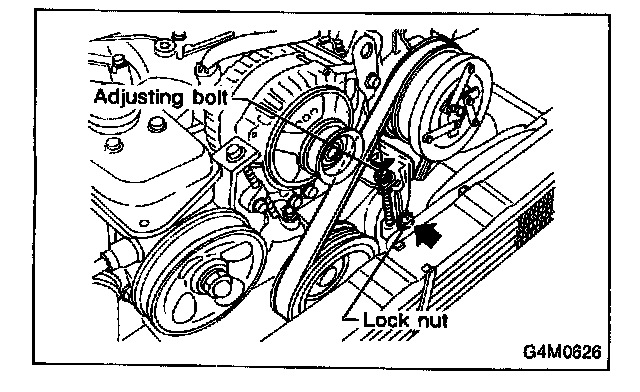 Loosen lock bolt on generator bracket. Turn adjusting bolt and remove V-belt.