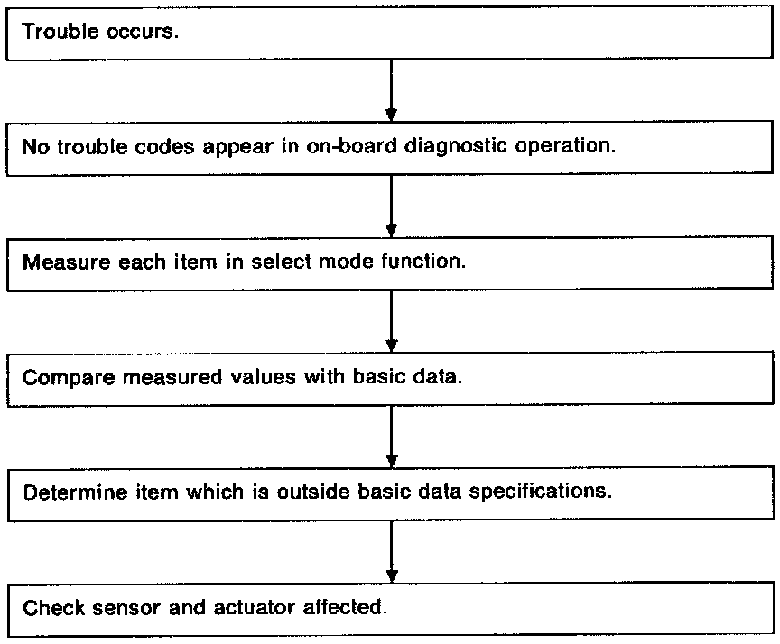 If no trouble codes appear in the on-board diagnostic operation (although problems have occurred or are occurring), measure performance characteristics of sensors, actuators, etc., in the "F" mode (select monitor function), and compare with the "basic data" to determine the cause of problems.