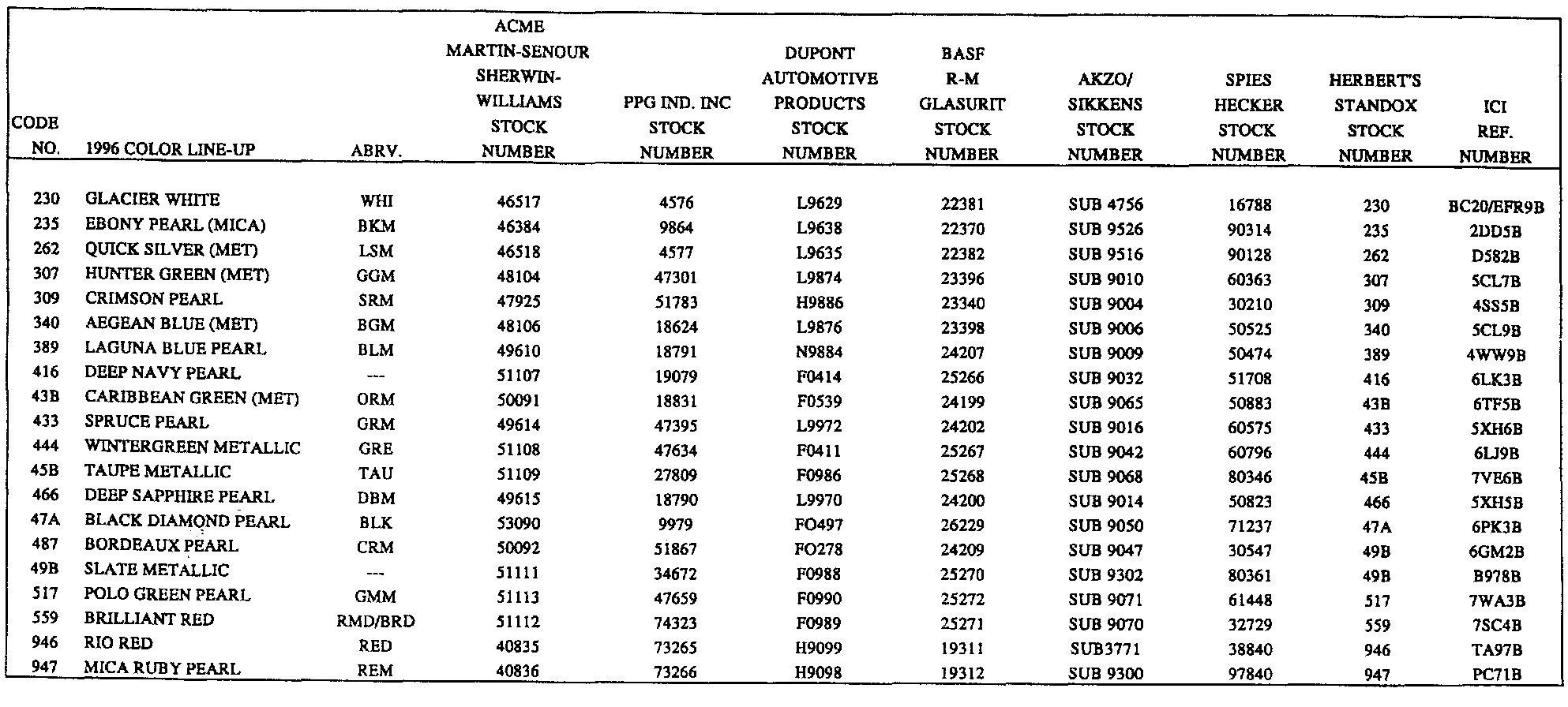 The stock numbers on the chart are designated by the various paint manufacturers. Because their formulas are updated on a continuing basis, the paint manufacturers have requested that dealers contact their local jobber/distributor for the most accurate/up-to-date formula.