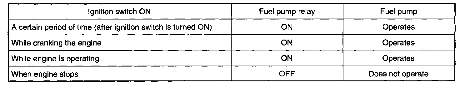 FUEL PUMP CONTROL- The ECM receives a signal emitted from the crankshaft position sensor and turns the fuel pump relay ON or OFF to control fuel pump operation. To improve safety, the fuel pump will stop if the engine stalls with the ignition switch ON.