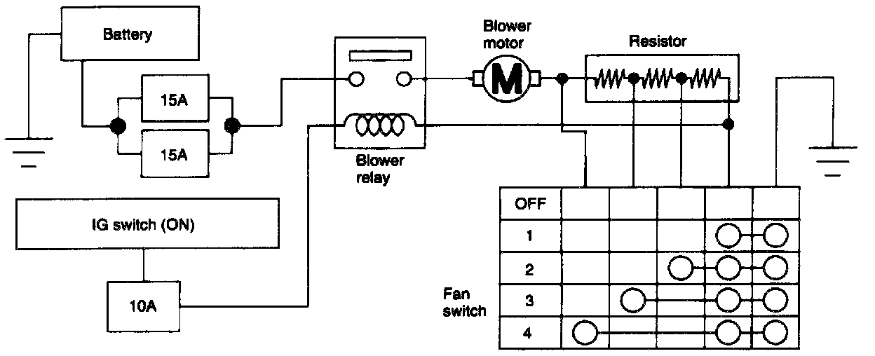 Operation of the blower relay is controlled by turning ON and OFF the ignition switch. When the ignition switch is ON and the fan switch is operated from 1st to 4th speed, electric current from the battery goes through the blower motor, the resistor, the fan switch and ground. The resistor is switched by the position of the fan switch, and controls the blower motor speed from 1st to 4th.