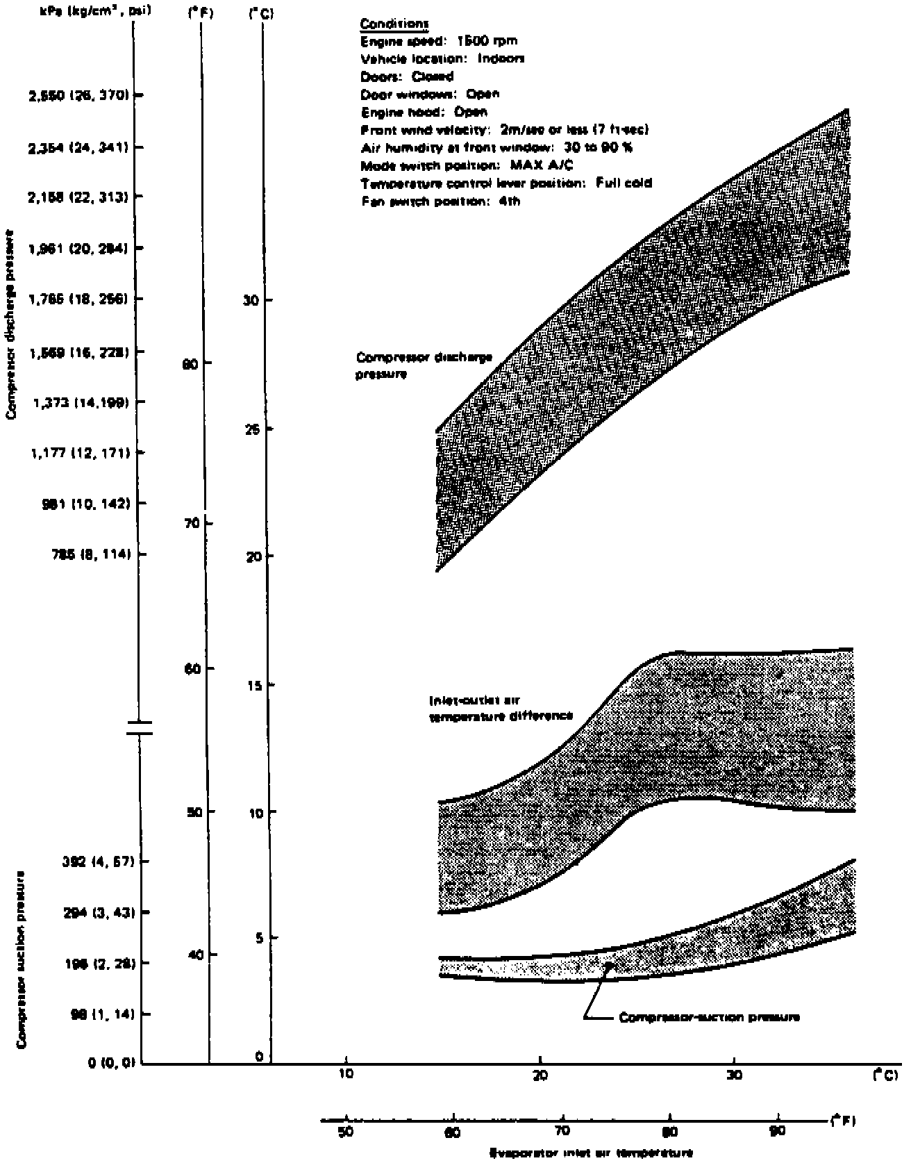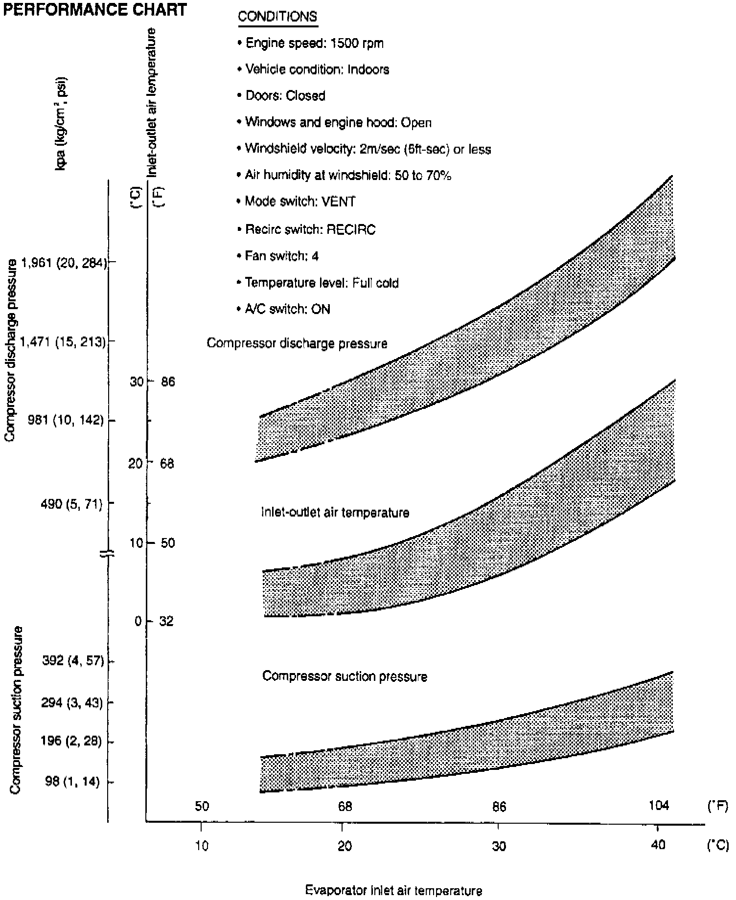 The cooling performance of the air conditioner changes considerably with changes in surrounding conditions. To check for correct system operation, follow procedure outlined below:1. Park the vehicle indoors or in the shade.