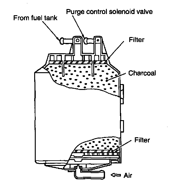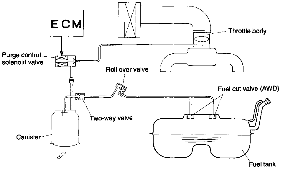 GENERALThe evaporative emission control system is employed to prevent evaporative fuel from being discharged into ambient atmosphere. This system includes a canister, purge control solenoid valve, fuel cut valve, their connecting lines, etc.
