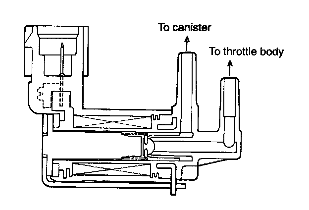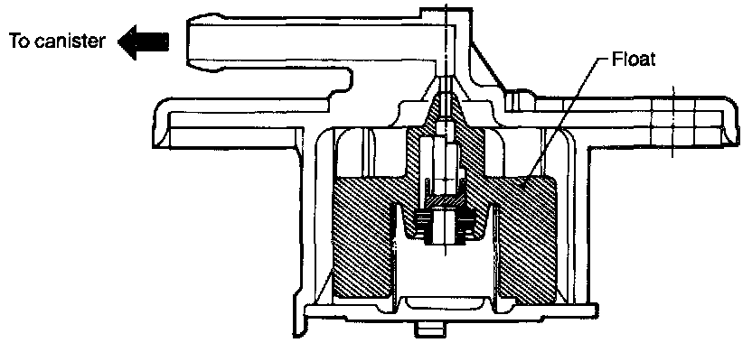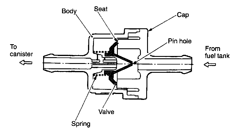 - When evaporation gas pressure in fuel tank drops specified value, the valve move to close the valve seat. However, air which enters from the inlet port of the canister is introduced into the fuel tank through the pin hole located at end of the valve.