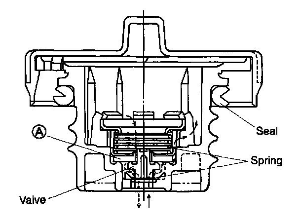 In normal condition, the filler pipe is sealed at (A) and at the packing pressed against the filler pipe end. As vacuum develops in the fuel tank, atmospheric pressure forces the spring down to open the valve; consequently air is led into the fuel tank controlling the inside pressure.