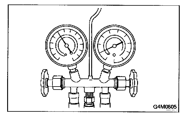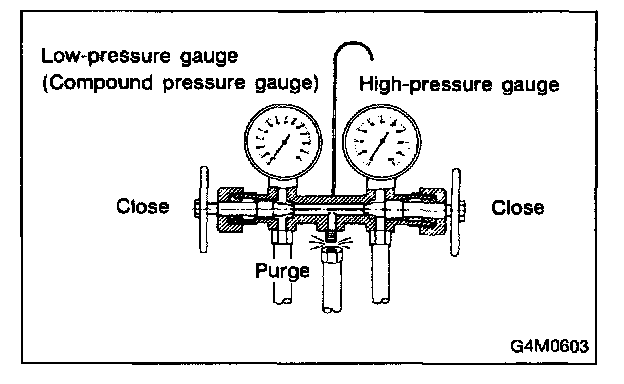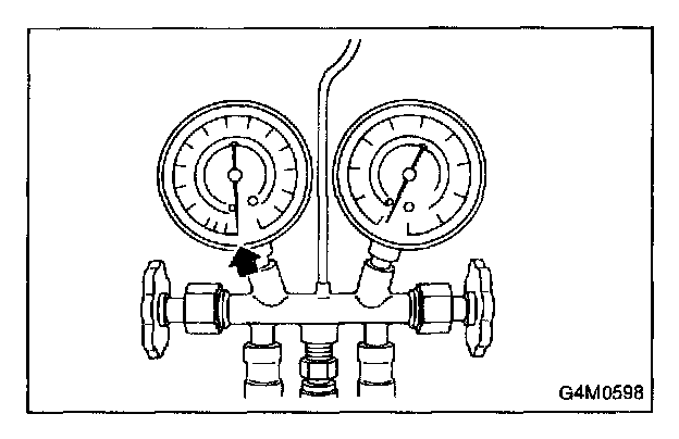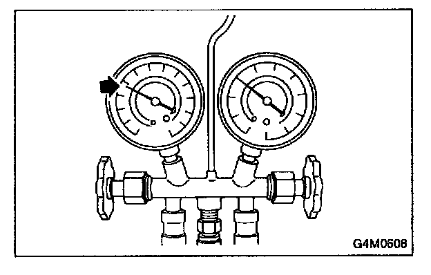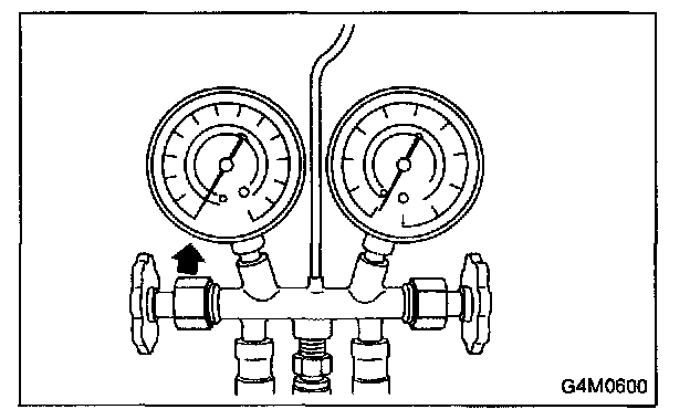 2. Attach the low-pressure manifold hose to the low- pressure service port on the vehicle. Check the low-pressure gauge. If more than 68.6 kPa (0.70 kg/sq.cm, 10 psi) is indicated, discharge the system prior to charging.