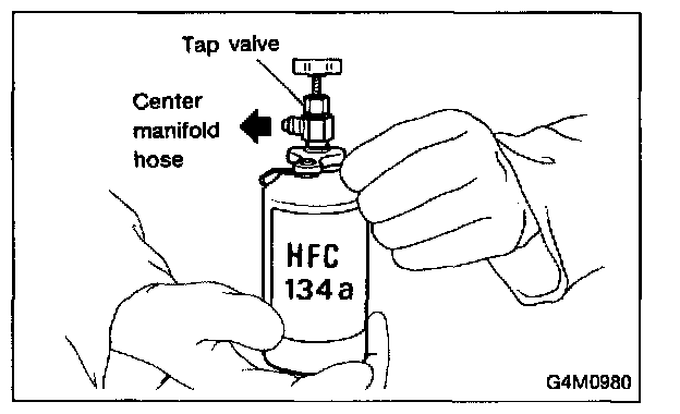 If the HFC-134a source is exhausted, first close the high-pressure manifold valve, second, close the can tap valve, then slowly purge the refrigerant from the service hose by loosening the fitting at the can tap. Repeat steps 15 through 19 as necessary.