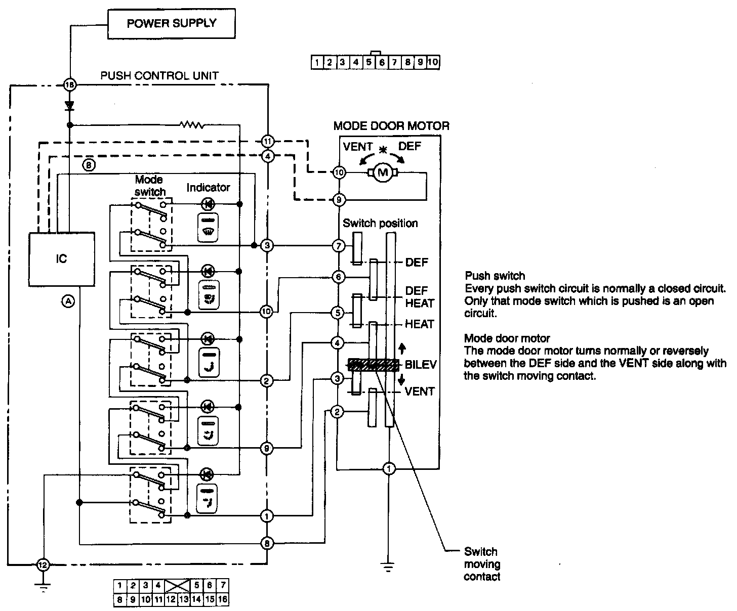 Both the mode switch and the position switch in mode door motor move together Current flows from the position switch in the mode door motor to body ground through IC circuits A and B which switch off the mode door motor