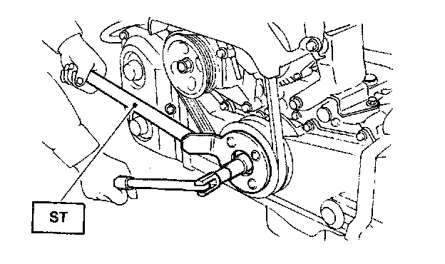 2) Remove pulley bolt. To lock crankshaft, use ST. ST 499977000 CRANKSHAFT PULLEY WRENCH