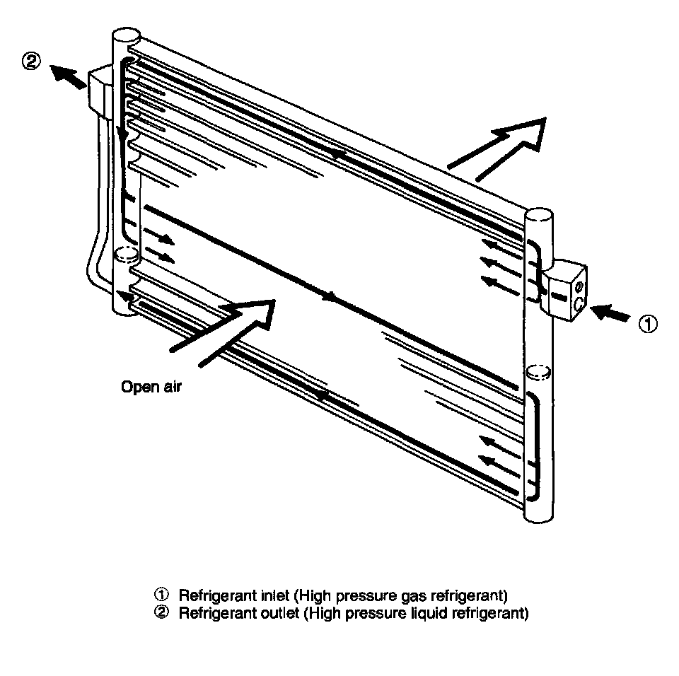 The heat from hot refrigerant radiates to the ambient air when high-temperature gaseous refrigerant passes through the condenser tubes.