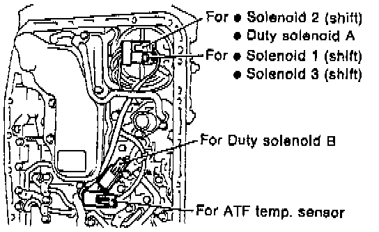 8. Disconnect the harness connectors for the solenoids and duty solenoids and the ground cord.