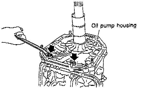 12. Loosen the reverse clutch drum lightly by turning the adjusting screw. Then remove the oil pump housing.
