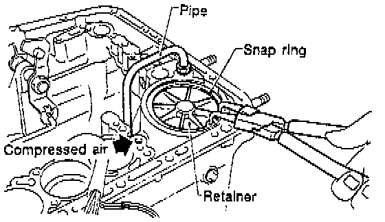 CAUTION: Hold the servo piston with a rag so that it will not be ejected with the air pressure. In this case, do not allow your finger to be pinched between the pipe and retainer.