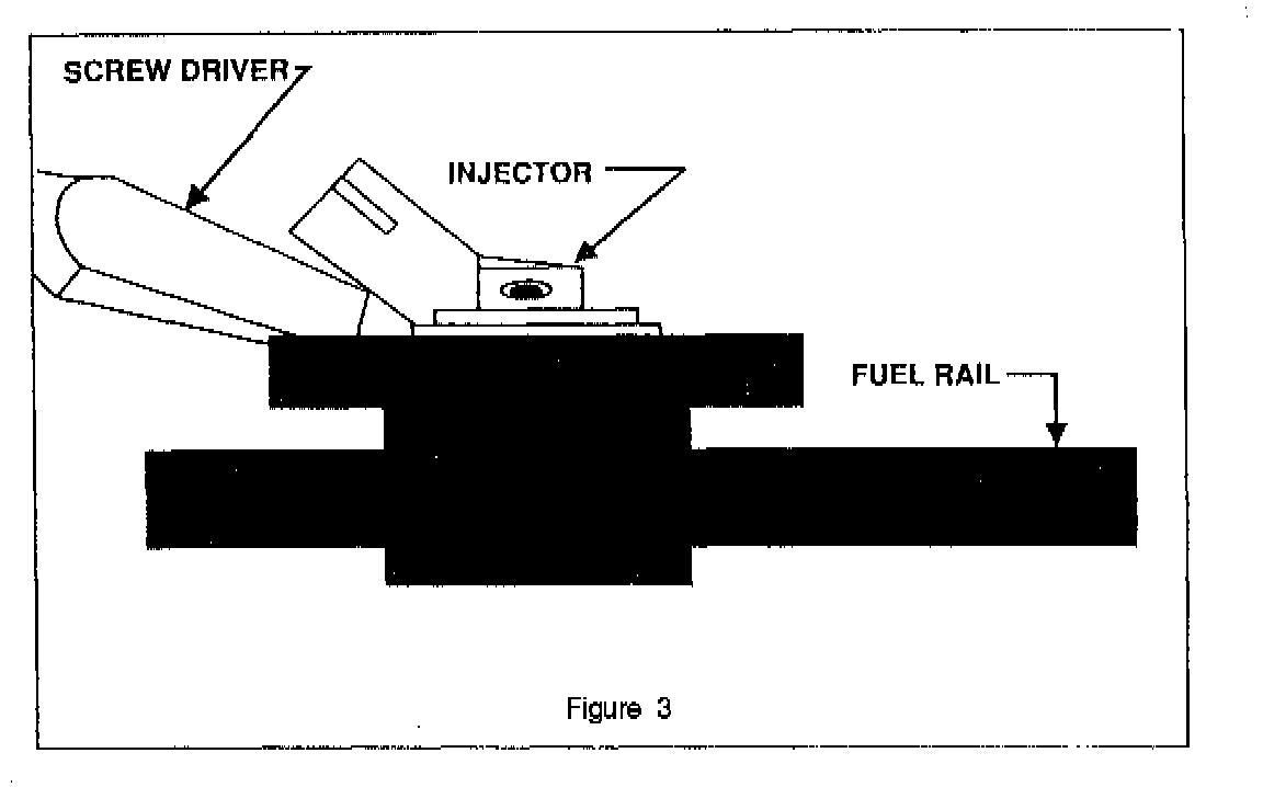5. Using a large flat screwdriver with a 3/8 to 1/2 inch blade gently pry the injector up by twisting the screw driver between the underside of the fuel injector connector area and the fuel injector cap mounting area. Refer to Figure 3. NOTE: Do not damage the fuel injector cap mounting threads.