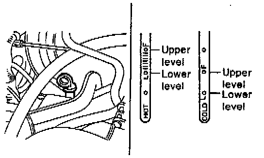 3. If the fluid level is below the center between upper and lower marks, add the recommended ATF until the fluid level is found within the specified range (above the center between upper and lower marks). When the transmission is hot, the level should be above the center of upper and lower marks, and when it is cold, the level should be found below the center of these two marks.