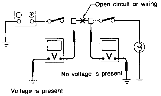 An open circuit is determined by measuring the voltage between respective connectors and ground using a voltmeter, starting with the connector closest to the power supply. The power supply must be turned ON so that current flows in the circuit. If voltage is not present between a particular connector and ground, the circuit between that connector and the previous connector is open.
