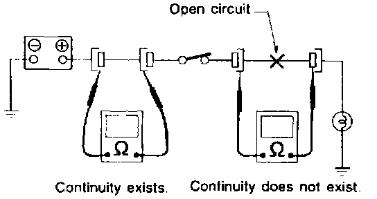 Disconnect all connectors affected, and check continuity in the wiring between adjacent connectors. When the ohmmeter indicates "infinite", the wiring is open.