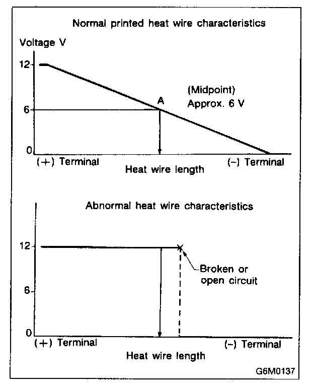 4. When tester indicates 12 volts when its probe reaches point "A", a broken circuit occurs between point "A" and the negative terminal. Slowly move tester probe toward the negative terminal while contacting it on heat wire to locate point where tester indication changes abruptly (0 volts). This is the point where a broken circuit occurs.