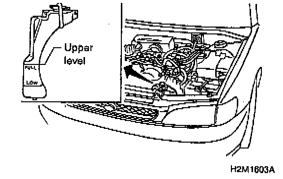 7. If engine coolant level drops from upper level of reservoir tank, add engine coolant to upper level.