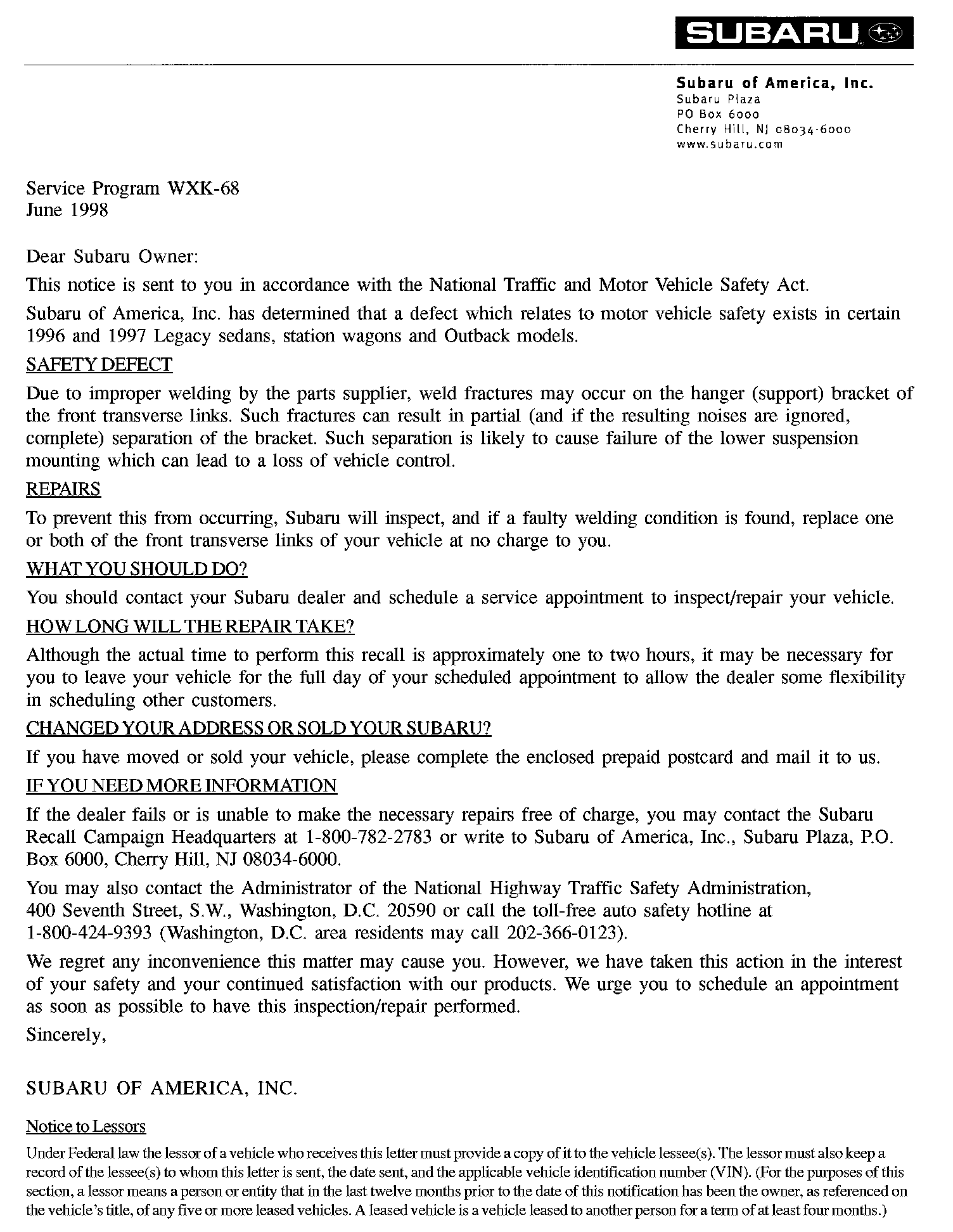 Subaru of America, Inc. has determined that some 1996 and 1997 Legacy vehicles manufactured from June 3, 1996 through September 30, 1996 may have a defective Transverse Link Assembly. Due to a supplier manufacturing error, some Transverse Links may have been welded incorrectly during production. This recall will involve examination of vehicles with potentially defective Transverse Links, and when required, inspection of the welds according to the check procedure. Links with welds which fail the inspection procedure will require replacement.