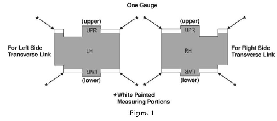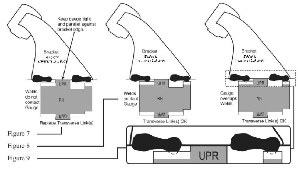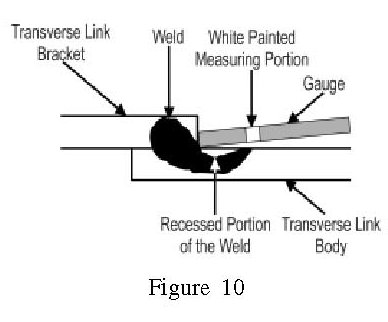 If the edges of the welds are recessed in the link and contact or are under the white painted portion of the gauge, this portion of the check is ok. Refer to figure 10. Make sure the portion of the gauge marked UPR is centered between both welds. Use the RH marked side of the gauge on the right transverse link and the LH marked side of the gauge on the left transverse link.