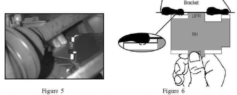 Step 1) Use the side marked UPR on the gauge and check the welds of the upper portion on the transverse links (LH and RH). Position the gauge marked UPR between both welds. Align the edge of the gauge tight and parallel with the transfer link bracket. Refer to figure 5. Keep the rear of the gauge raised up on a slight angle away from the Transverse Link. This is to prevent any weld flashing bead interference with the gauge. Refer to figure 6.