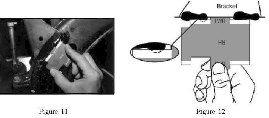 Step 1) Use the side marked LWR on the gauge and check the welds of the lower portion on the transverse links (LH and RH). Position the gauge marked LWR between both welds. Align the edge of the gauge tight and parallel with the transfer link bracket. Refer to figure 11 Keep the rear of the gauge raised up on a slight angle away from the Transverse Link. This is to prevent any weld flashing bead interference with the gauge. Refer to figure 12.