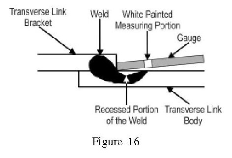 If the edges of the welds are recessed in the link and contact or are under the white painted portion of the gauge, this portion of the check is ok. Refer to figure 16. Make sure the portion of the gauge marked LWR is centered between both welds. Use the RH marked side of the gauge on the right transverse link and the LH marked side of the gauge on the left transverse link.