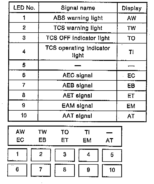NOTE: If the system is normal when idling the engine without depressing brake pedal, LED No. 6 comes on, LED No. 9 blinks and all other LED's are off.