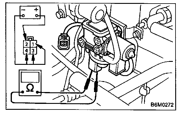 2. Make sure that cruise control cable moves smoothly when connecting + (positive) battery cable to terminal No.2 and - (negative) battery cable to terminals No.1, 3 and 4 of vacuum pump and valve connector.