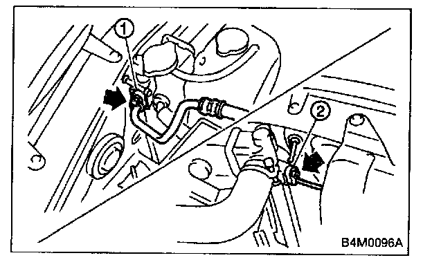 6. Disconnect high-pressure hose (1) and high-pressure pipe (2) from condenser.