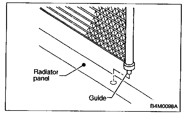 NOTE: After installing condenser, ensure that guide on lower side of condenser is inserted into hole in radiator panel.