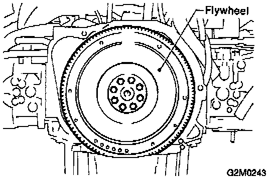 NOTE: Tighten flywheel installing bolts gradually. Each bolt should be tightened to the specified torque in a crisscross fashion.