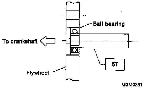 2. Install Special Tool (ST), and tighten the flywheel attaching bolts to 72 +/-3 Nm (52.8 +/-2.2 ft. lbs.).