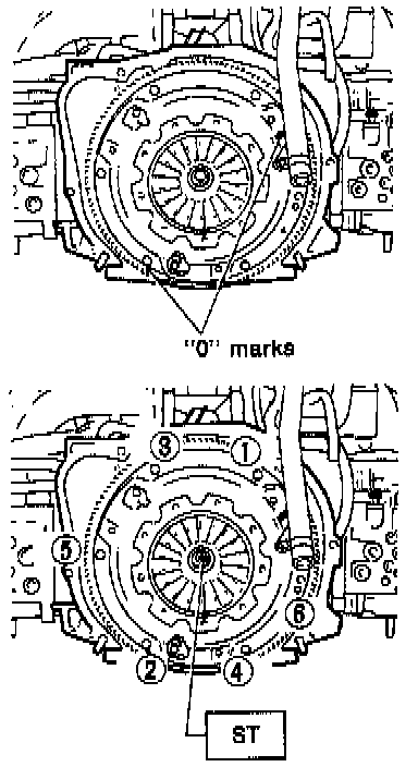 - When installing the clutch cover on the flywheel, position the clutch cover so that there is a gap of 120° or more between "0" marks on the flywheel and clutch cover. ("0" marks indicate the directions of residual unbalance.)