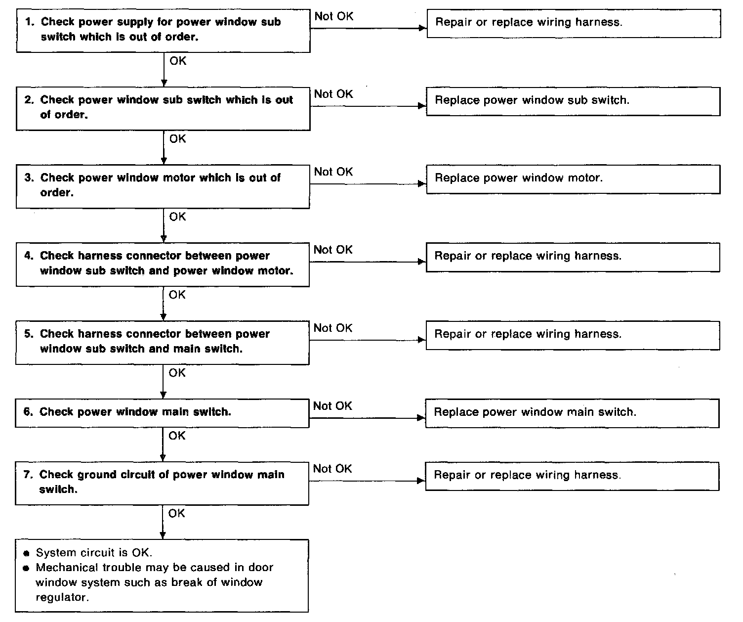 1. CHECK POWER SUPPLY FOR POWER WINDOW SUB SWITCH WHICH IS OUT OF ORDER.