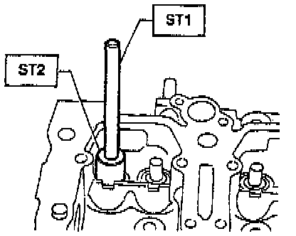 5. Put new valve guide, coated with sufficient oil, in cylinder, and insert ST1 499767200 valve guide remover, or equivalent into valve guide. Press in until the valve guide upper end is flush with the upper surface of ST2 499767000 valve guide adjuster, or equivalent.