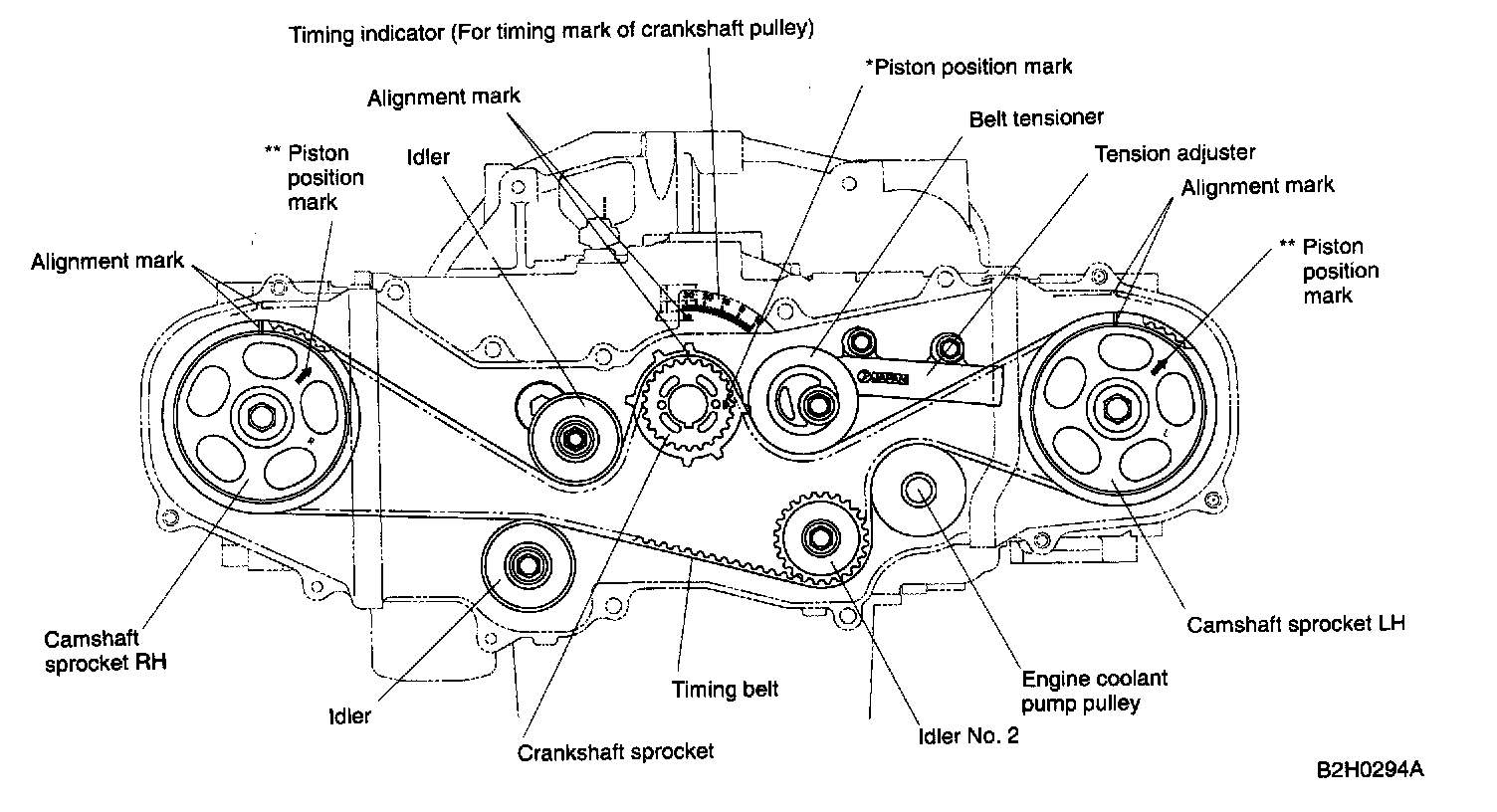 **: #1 piston is set at TDC (Top Dead Center) on compression stroke when piston-position mark on camshaft sprocket is aligned with mark on belt cover.