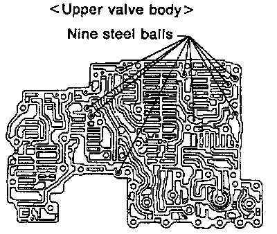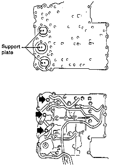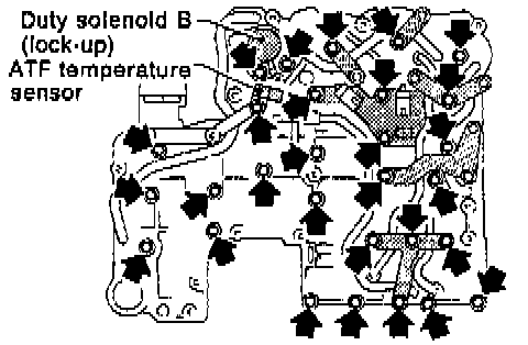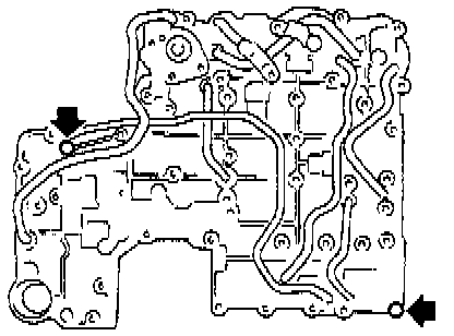 - Remove the upper-lower valve body tightening bolts. Then remove two locating bolts (indicated by darkened arrows, above).