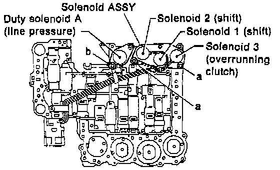 8. Install the shift solenoid and duty solenoid A.