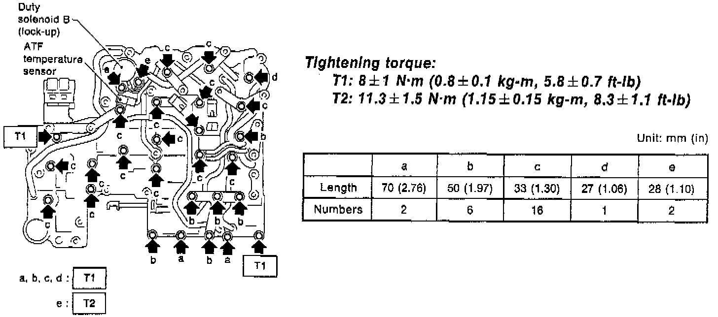 NOTE: The control valve is composed of parts which are accurately machined to a high degree and should be handled carefully during disassembly and assembly. As these parts are similar in shape, they should be arranged in neat order on a table after disassembly so that they can be easily installed to their original positions. Spring loaded parts should be also handled carefully, as springs may jump out of place when the parts are disassembled or removed. Extreme care should be taken so as not to drop valves on the floor. Before assembling, the parts and valves should be dipped in a container filled with the ATF. Make sure that the valves are clean and free from any foreign material before assembly. Torque specifications should also be observed.