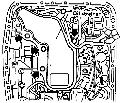 5. Remove oil strainer. Disconnect oil pipe by removing the two bolts, and remove four bolts and oil strainer. Be careful because oil flows from oil strainer.