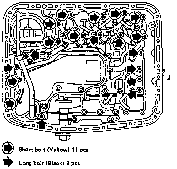 6. Remove control valve body. Remove 8 long bolts (Black) and 11 short bolts (Yellow). Be careful because oil flows from valve body.