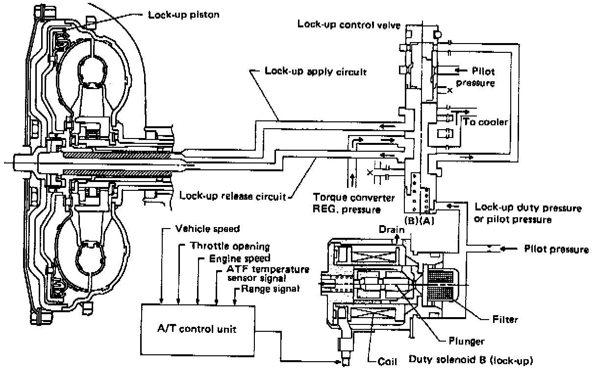 The operating pressure generated by the shift valve A is applied to the shuttle duty shift valve, which pushes the lock-up control valve to the "engaging" position. Since the lock-up operating pressure is applied to the engaging side circuit while the disengaging circuit is drained, the lock-up clutch is engaged by the pressure difference.